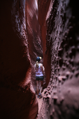 The trail to the slots involves a 1-mile-plus hike down a moderately steep slick-rock slope, all marked by cairns. The route then drops you down into the sandy Dry Fork Wash. Peek-a-boo Gulch, on the other side of the wash from where you entered, is the first one you come to and involves a lot of rock scrambling.