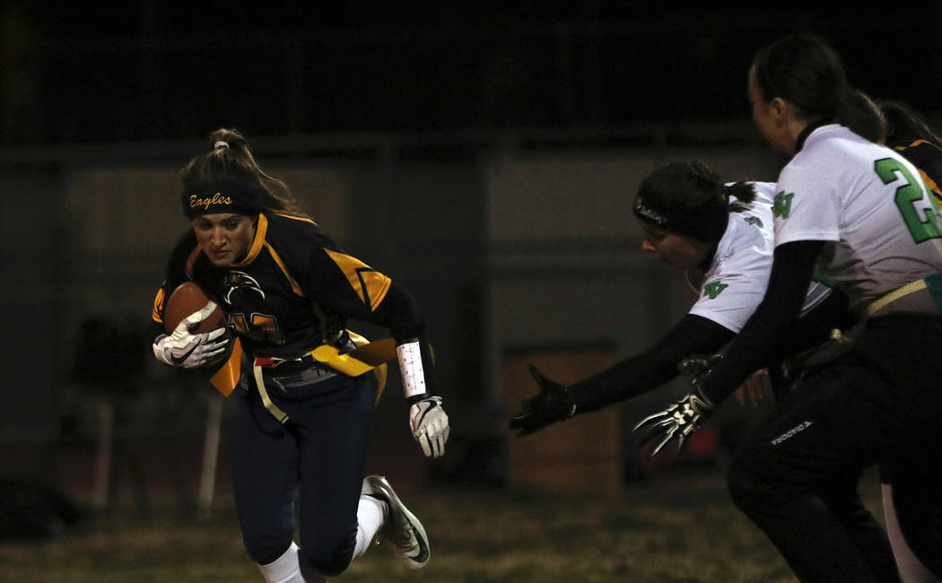 Southeast Career Technical Academy quarterback Taylor Ritayik led a come-from-behind victory over Boulder City High School in flag football on Tuesday, throwing a pair of touchdowns in the last five minutes of the fourth quarter to sink the Lady Eagles 12-6.