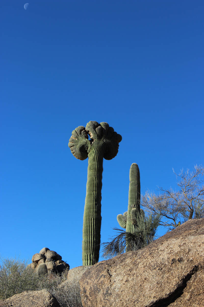 Consider yourself very fortunate if you happen along a rare crested or cristate saguaro. This is where the growing tip fans out and often with a rounded appearance. Experts disagree on why this rare event happens but speculation runs from a lightning strike to freeze damage to a genetic mutation.