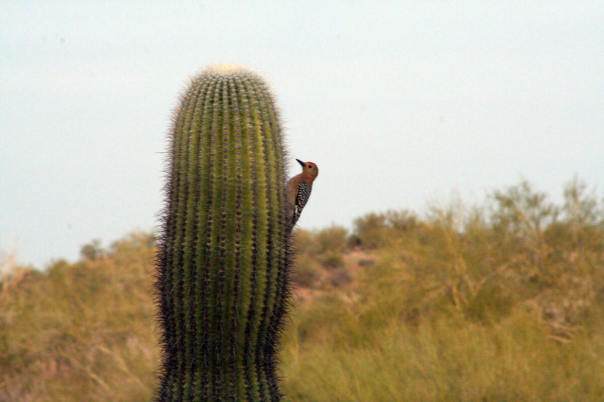 The saguaro is host to many avian species. The gilded flicker and Gila woodpecker make nest cavities in the fleshy interior and once they abandon that space, elf owls, purple martins and finches often take over the home. Large birds such as Harris’ and red-tailed hawks sometimes build their nests among the cacti arms.