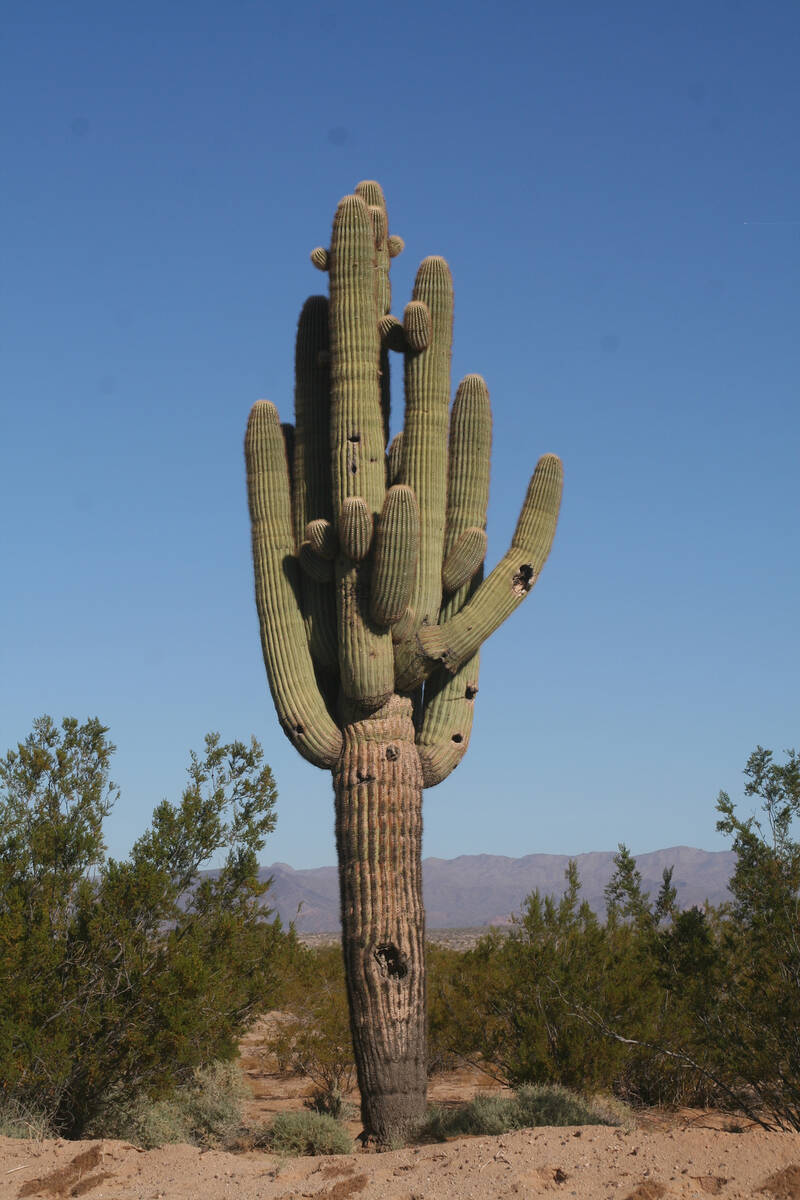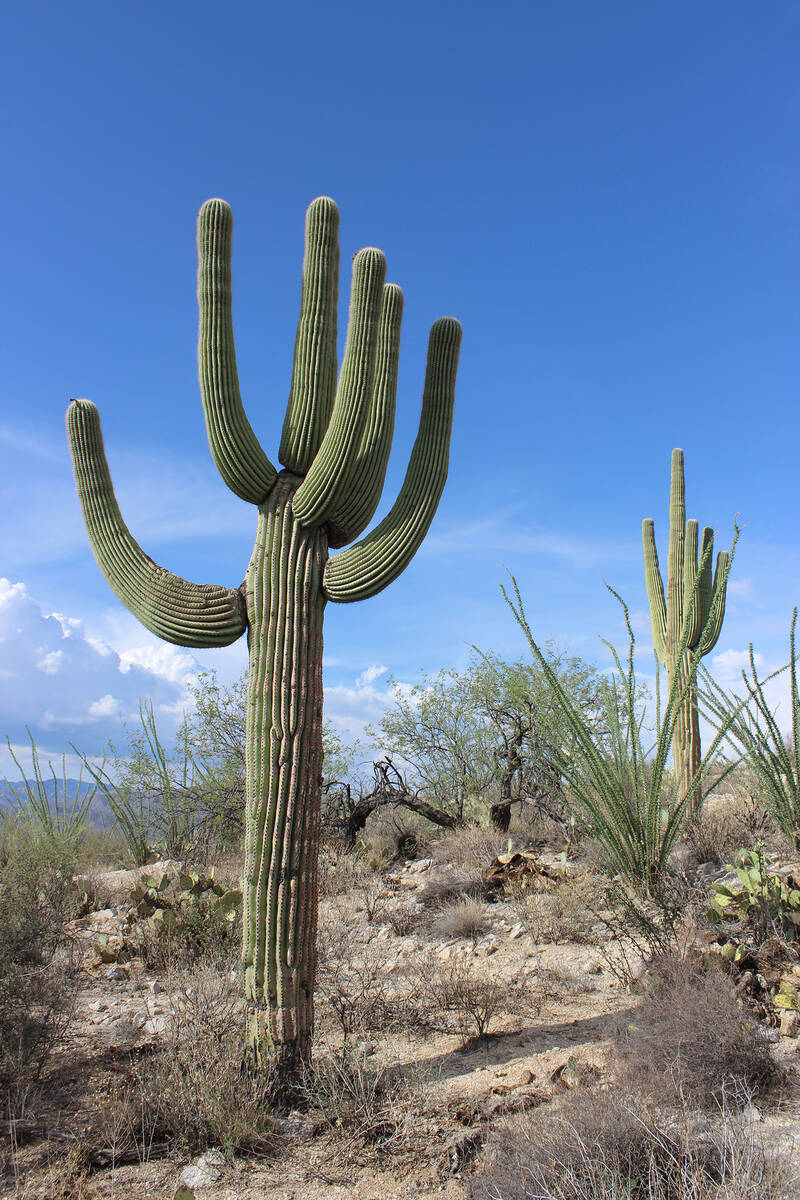 Saguaros are extremely slow growers and even a small one, a couple of feet high, might be 30 years old. At a quick glance, these small columnar ones can be confused with other cacti, such as the barrel cactus, for a saguaro’s first arms might not grow until the plant is 50 to 100 years old. Some saguaros don’t ever grow arms.