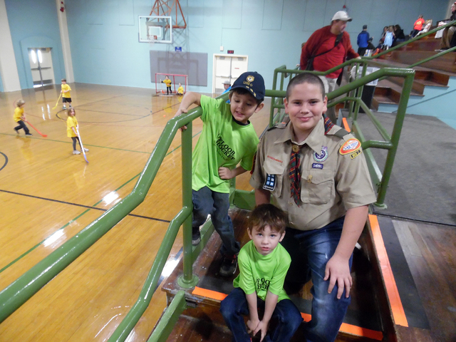 Landyn Rowe, 5, left, and Mason Rowe, 4, who will play for the Leprechauns, attended the opening ceremony for their first season of youth floor hockey with Gage Dalton, 11, who played in the league for five years.