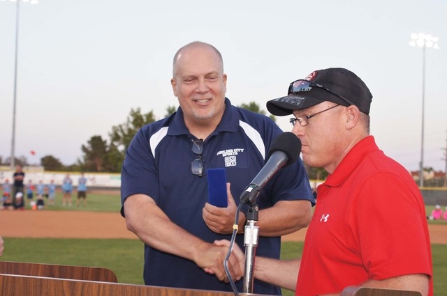 Tay Deering was presented with a key to the city by Mayor Roger Tobler Monday at opening ceremonies for Boulder City’s baseball league.