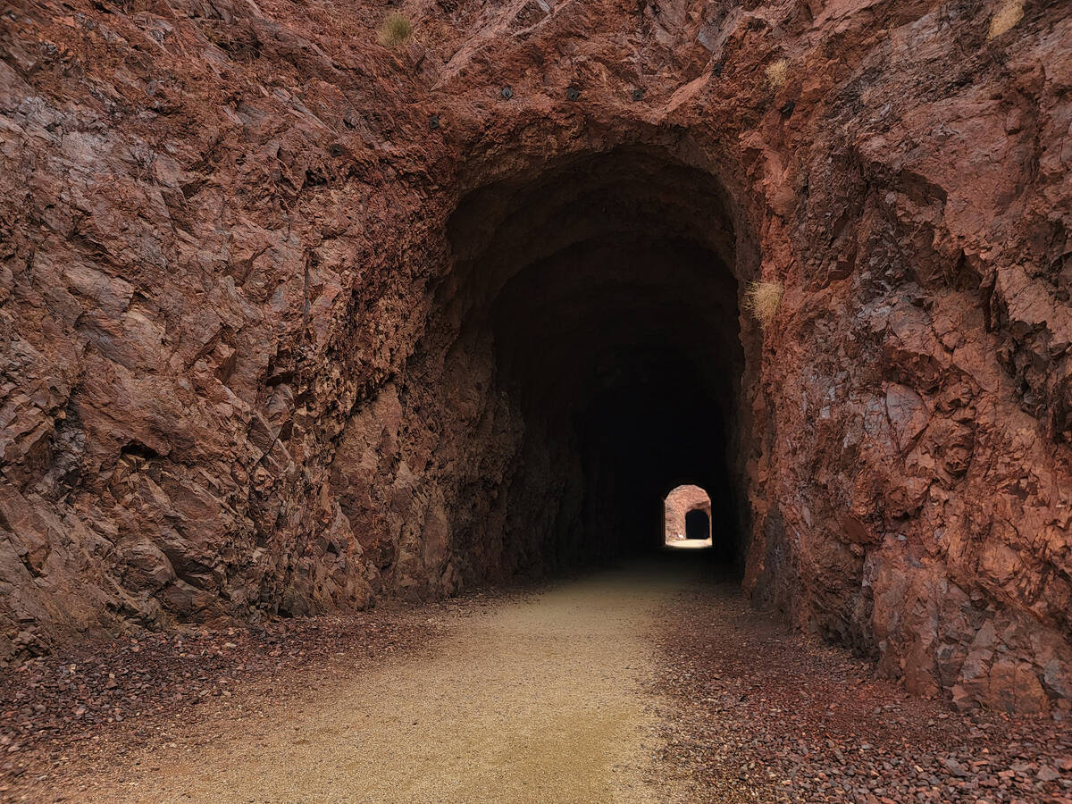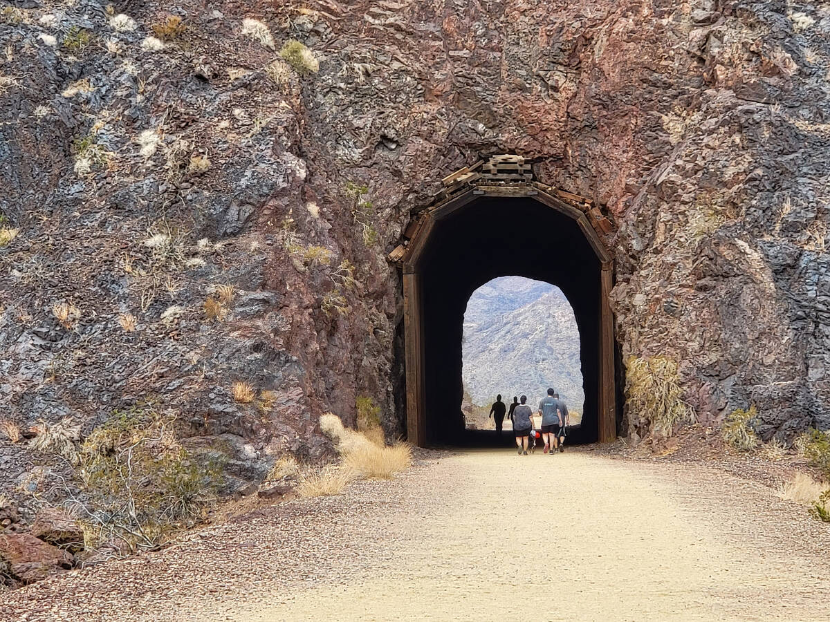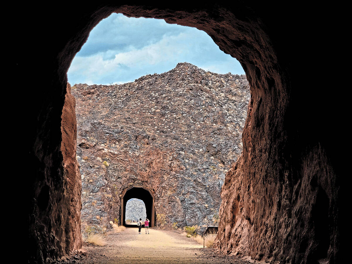 Whether the goal is simply to walk through the five tunnels and turn around or to continue all the way to the dam before traveling back to the trailhead’s parking lot, walkers and bicyclists can expect a brief time in the Mojave Desert at the trail’s start before stepping onto the wide packed-dirt path left behind by standard-gauge railroad tracks laid for Hoover Dam’s construction. Trains played a pivotal role in the project and delivered 9 million tons of gravel and sand to the site, along with other essential building materials and machinery supporting the construction of the dam and companion power plant.