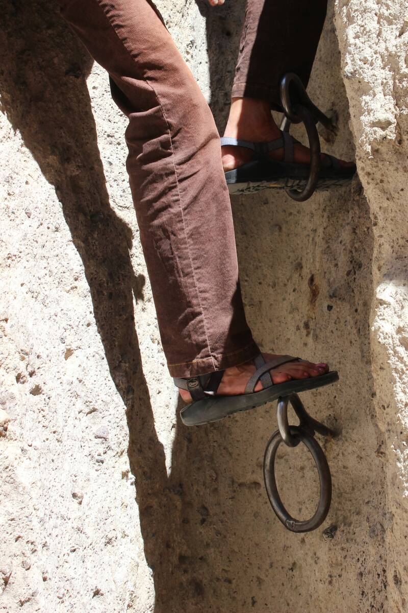The easiest way to get started on the descent is to turn around and face the wall where the rings are located. Grab the first ring and lower yourself down, so one of your feet is firmly in a lower ring or atop one of the bolts anchoring each of the four rings. Then grab the next ring down and lower the other foot. Repeat until you are standing on firm ground.