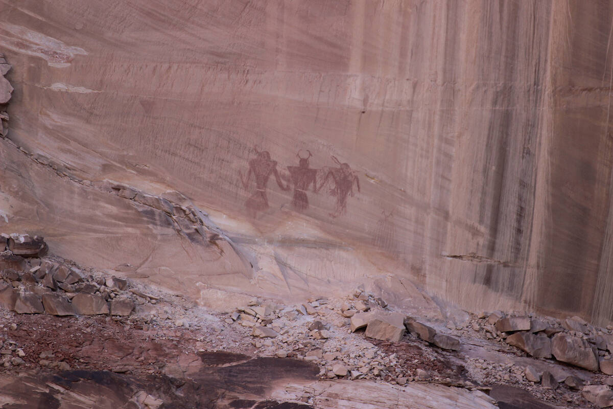 Warrior pictographs can be seen across the canyon on the east side. Look on the smooth-faced wall for three large figures painted in red pigment. Their trapezoidal shape with legs and arms along with headdresses are a good representation of Fremont-style rock art. Like all archaeological sites, one should never touch or otherwise disturb these fragile drawings.