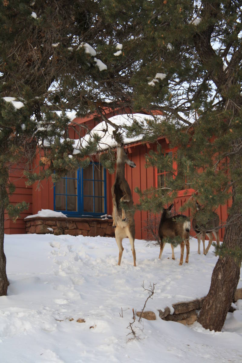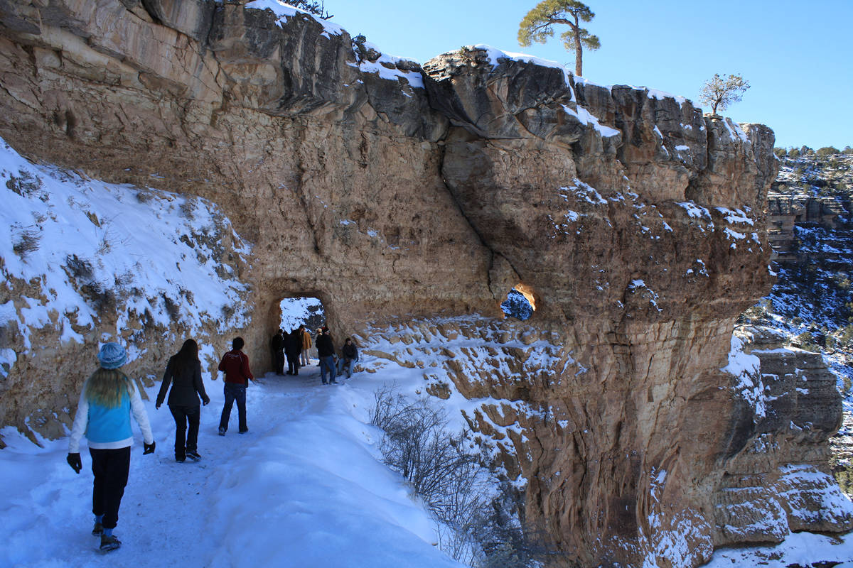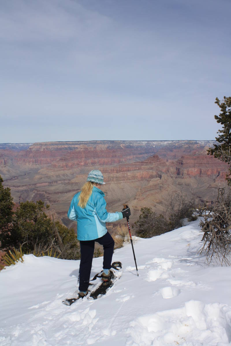 For winter hiking, carry water and food, dress in layers of warm clothing (no cotton) from tip to toe, use hiking poles and be sure to have a pair of STABILicers or Yaktrax or other boot/shoe traction devices to attach to your boots if there is ice or snow on the trails. They are available at sporting goods stores, Amazon or in the park at the Grand Canyon Marketplace.