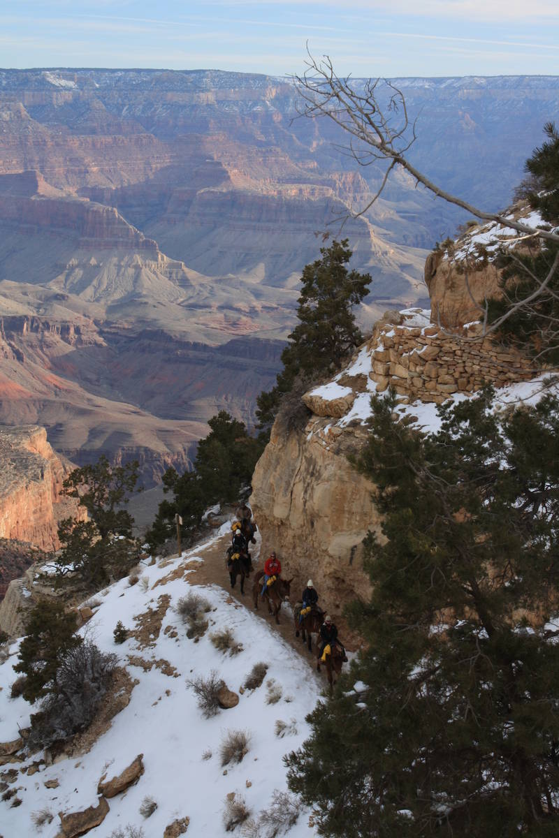 Wrangler-led mule trains also use this trail to access the canyon, so use caution when they approach. Where possible stand on the uphill side of the trail and wait quietly until the last mule has passed by at least 50 feet. (To schedule an overnight mule trip to Phantom Ranch or the two-hour, 4-mile Canyon Vistas Rim Ride, go to Xanterra.com or call 888-297-2757.) You don’t descend into the canyon on the rim ride, but it’s a good trip that stops at least six times along the way. Wranglers provide information about geology, human history and more. There are restrictions concerning age, height and weight, and the trips book up far in advance, but cancellations commonly create late openings.