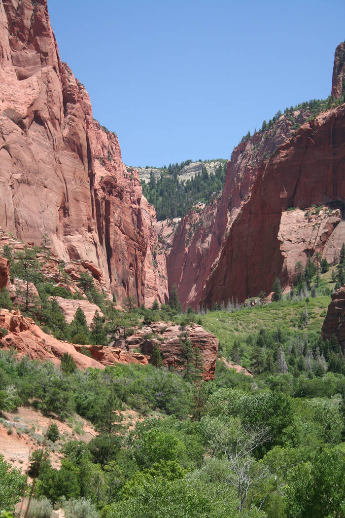 The scenic drive ends at the trailhead for the Timber Creek Overlook Trail. This is an easy 1-mile round-trip hike and good for almost everyone, except at the very end, where it is rather rocky with uneven footing. It also affords spectacular, far-reaching views. On a clear day you can see all the way to the Arizona Strip, views which have few equals in Zion without a lengthy, strenuous hike. It’s a good idea to bring along a pair of binoculars, if you have them.